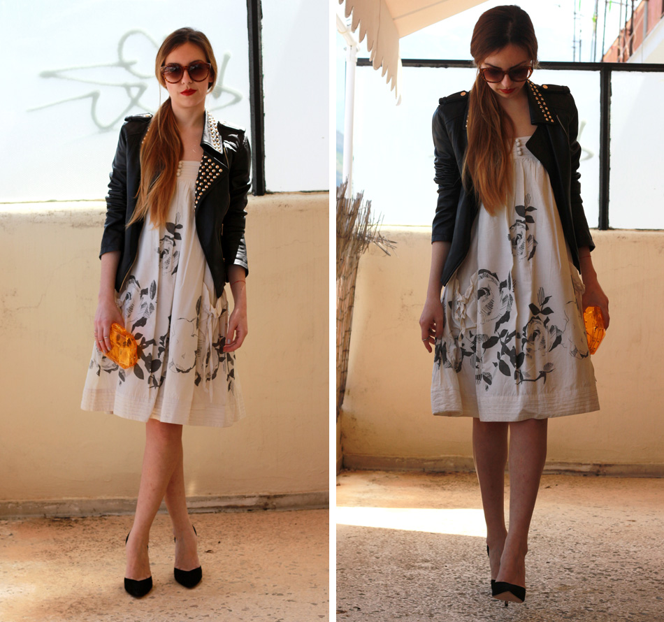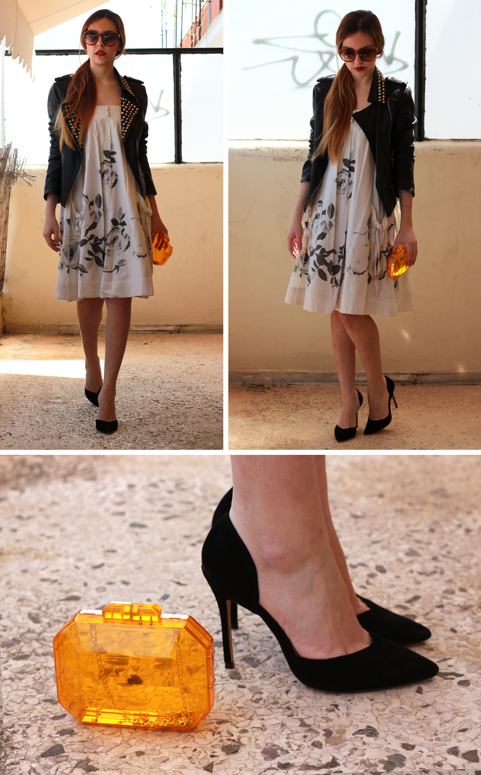 Wearing Ted Baker dress, Zara leather jacket, cropped top, pointy heels and clutch and Bershka sunglasses.