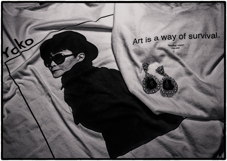 Imagine Because art is the best way to survive the routine of everyday life. Yoko Ono t-shirts and panther earrings from Zara.