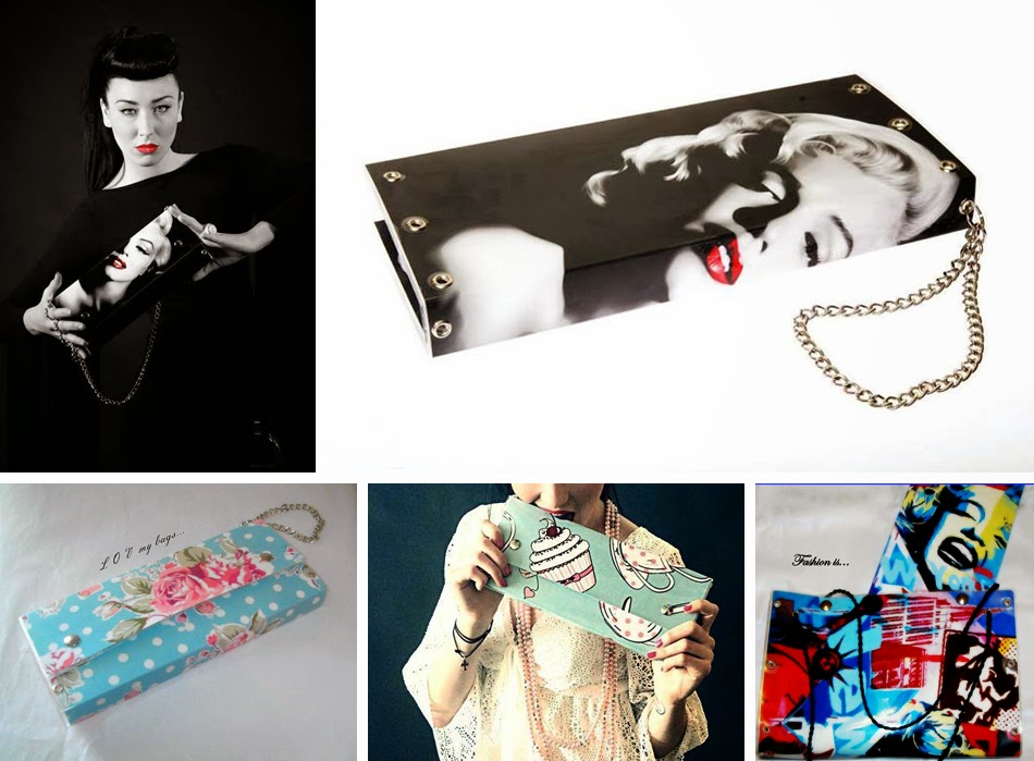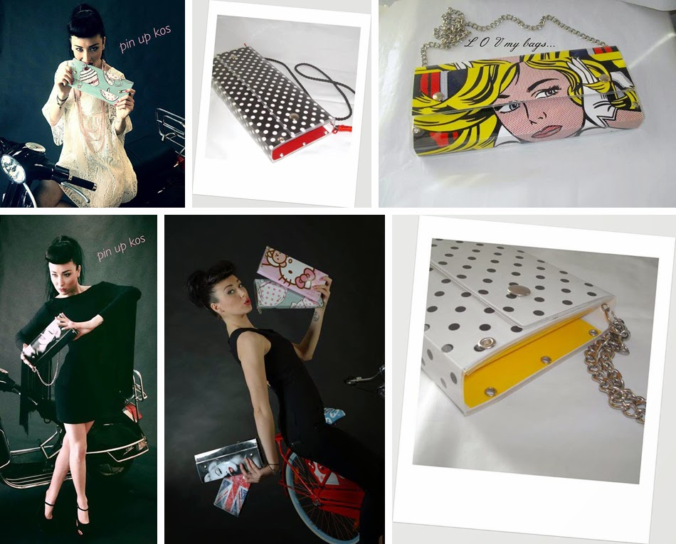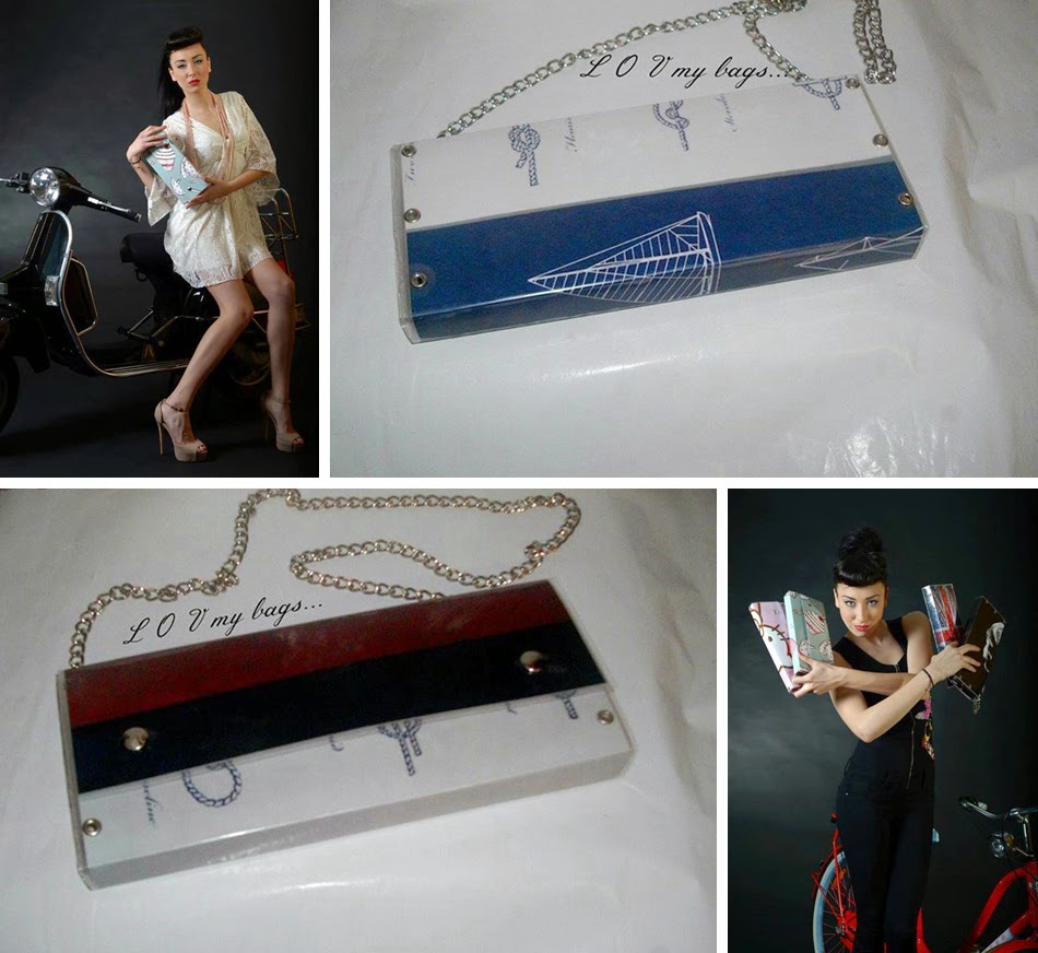 My bags are created by plasticized paper!!! This gives me the opportunity to print on paper any image and design I imagine or my customer wants. I get inspired by pretty much everything but my main source of inspiration is fashion trends and my basic tool is the Internet. After a design is printed and plasticized, I use studs, buttons, chains, strings and other materials to complete them.