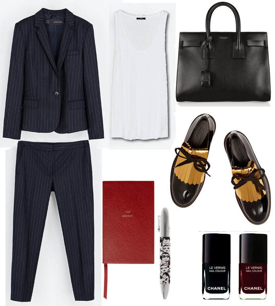 When it comes to the pinstripe suit, things are no longer business as usual. Sure, it’s still the appropriate choice when you want — or think it advantageous — to exert a little more influence at the office, but presently it is being reassigned to more out-of-the-office affairs, thanks to the stylish, powerful image it represents. You can style it with a classic white shirt, a simple top or a lingerie-like top. Here I prefered to show you a loose white tank top which makes it look very feminine and effortless. For your day looks prefer statement brogues and a big tote bag. Later change your brogues with an uber sexy pair of pointy heels and a smaller bag. Easy, modern, elegant and sophisticated.